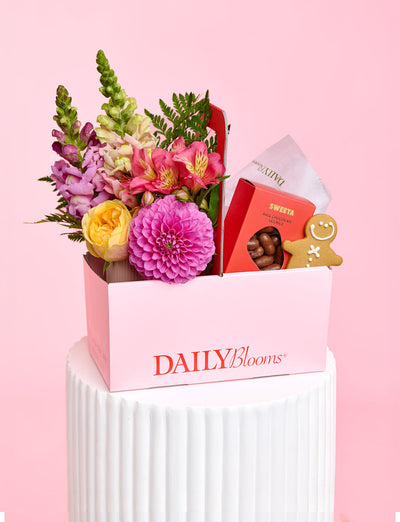 The Floss Delight Bundle features a vibrant mix of seasonal blooms, paired with Bahen & Co Raspberry & Rose Chocolate and Sweeta Honey Roasted Cashews....